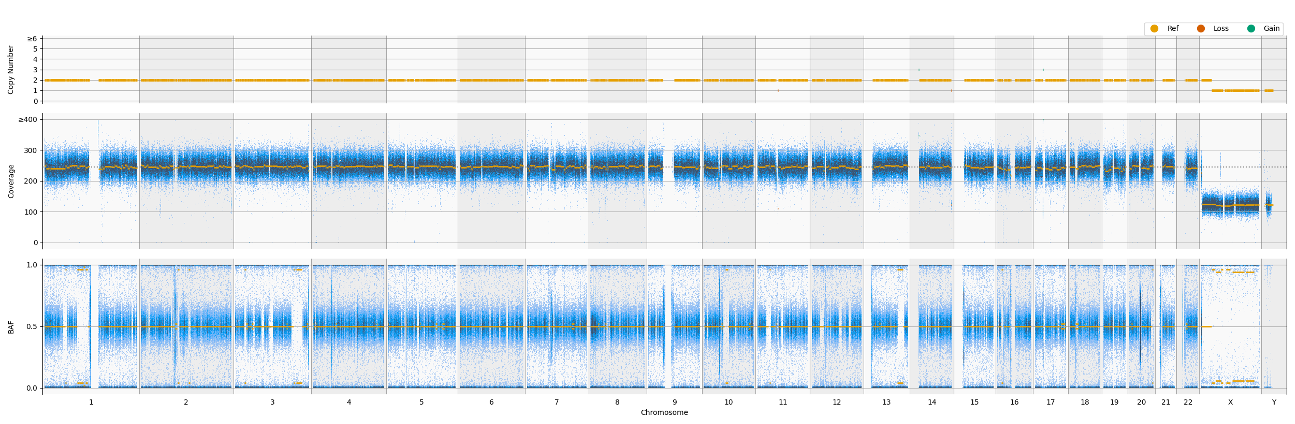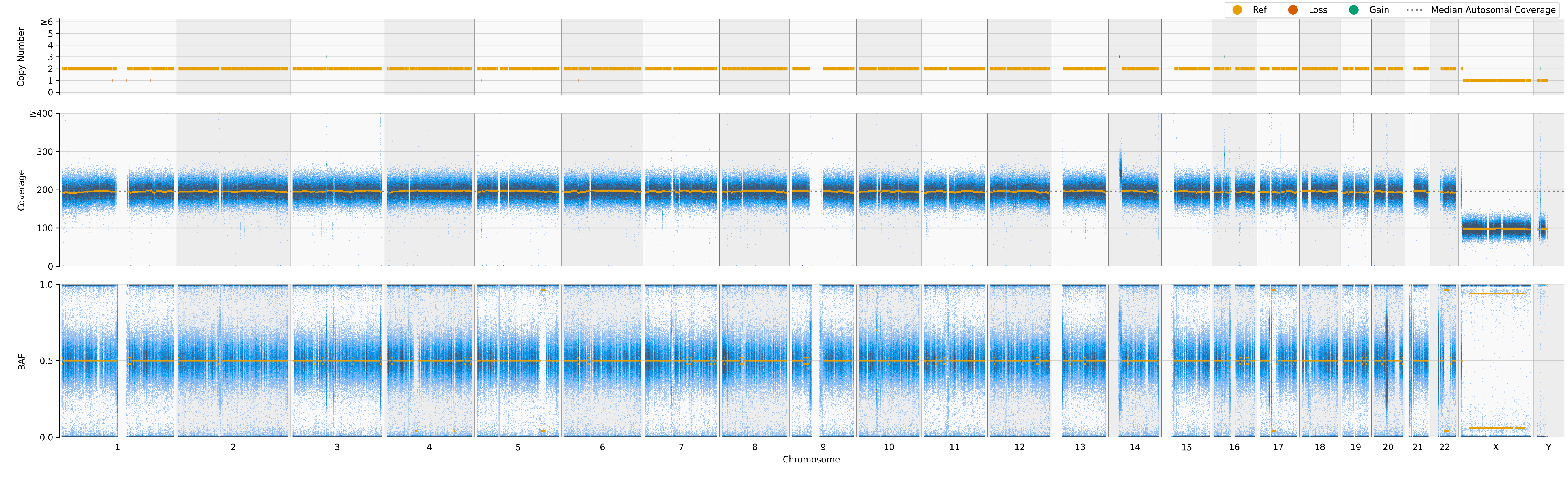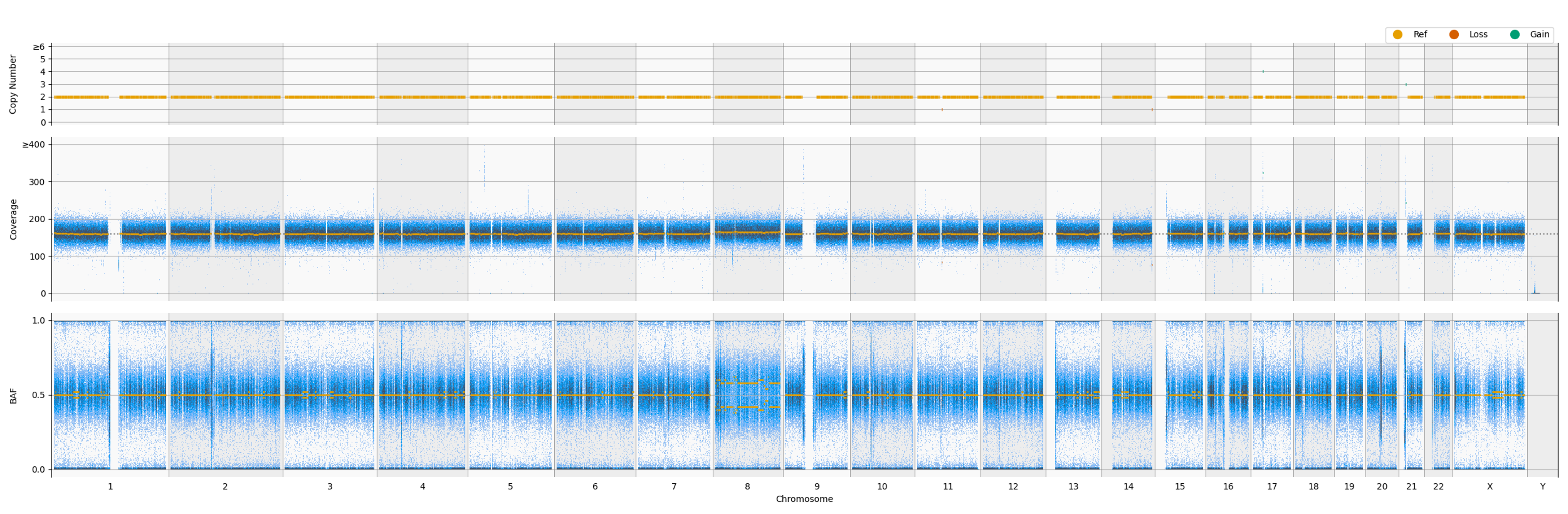 | general trends (solid lines) for coverage and B-Allele frequencies | Solid lines are provided to indicate general trends observed for sequencing coverage and B-Allele frequencies. The regions that are plotted as solid lines mirror the regions that are reported in the CNV vcf, and therefore may not perfectly align with the boundaries of other detectable features (e.g. homozygous regions or regions implicated in uniparental disomies). For coverage, the solid line marks the median coverage and the line colour reflects the CNV status. For B-Allele frequencies, the orange line represents the modal (i.e. most common) value for non-homozygous B-allele frequencies, and is included for all regions with >250 non-homozygous B-Allele frequency observations. |