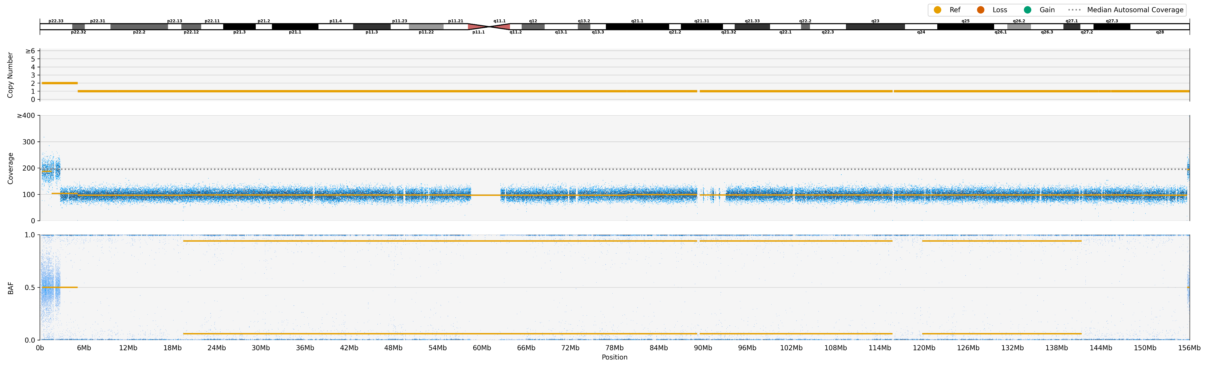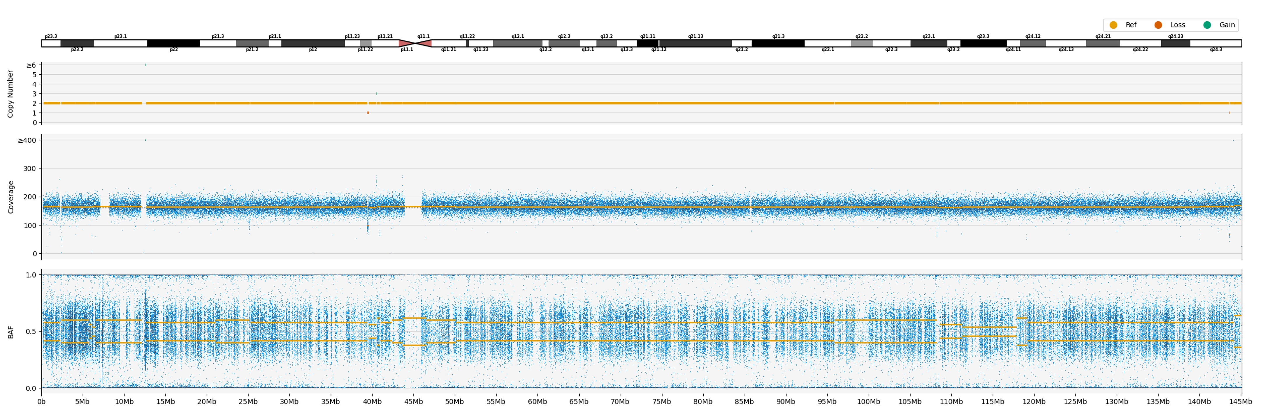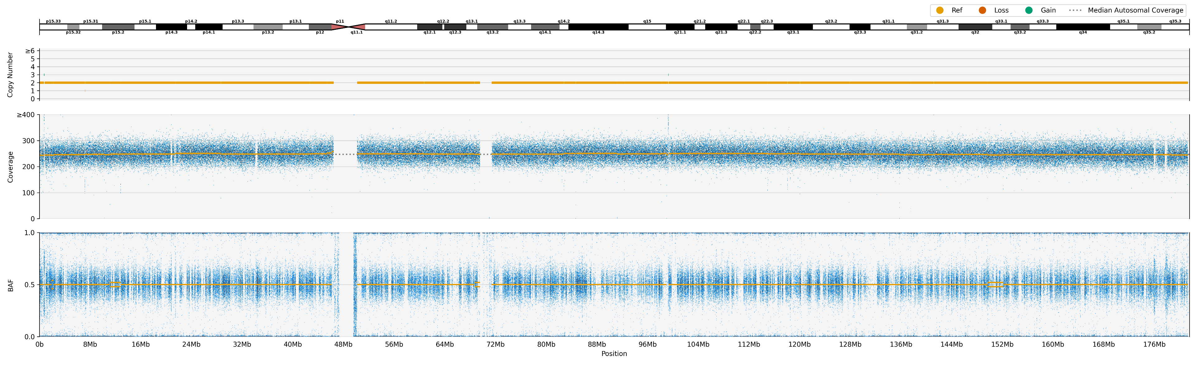 | general trends (solid lines) for coverage and B-Allele frequencies | Solid lines are provided to indicate general trends observed for sequencing coverage and B-Allele frequencies. The regions that are plotted as solid lines mirror the regions that are reported in the CNV vcf, and therefore may not perfectly align with the boundaries of other detectable features (e.g. homozygous regions or regions implicated in uniparental disomies). For coverage, the solid line marks the median coverage and the line colour reflects the CNV status. For B-Allele frequencies, the orange line represents the modal (i.e. most common) value for non-homozygous B-allele frequencies, and is included for all regions with >250 non-homozygous B-Allele frequency observations. |